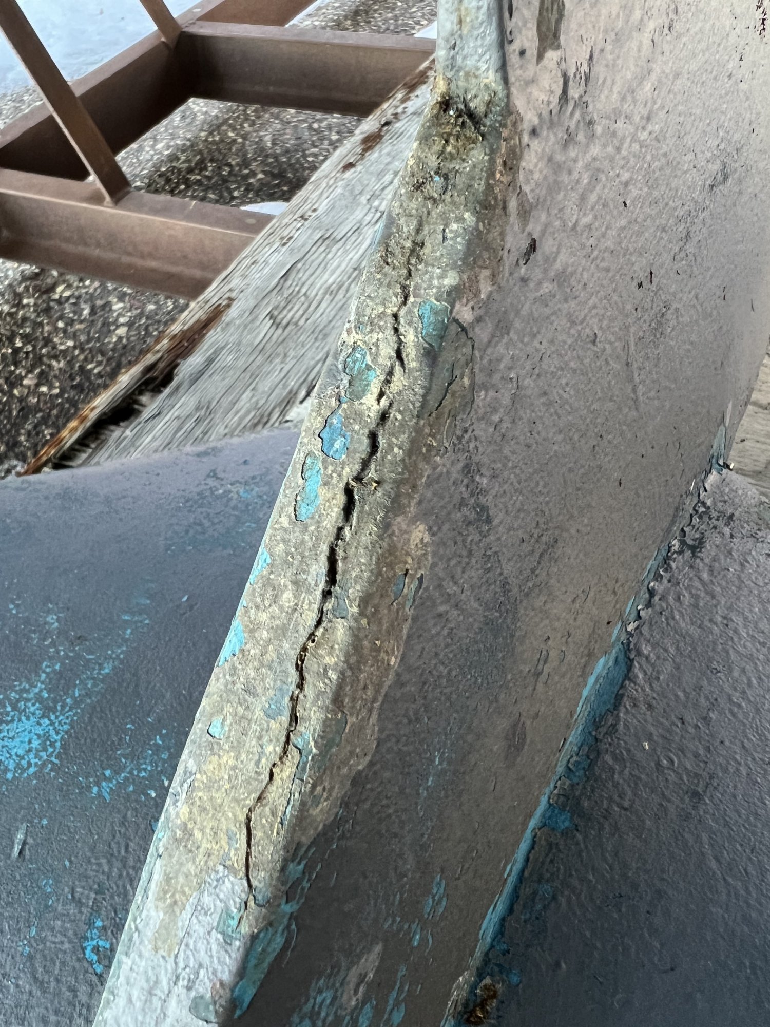 The bend in the port wing is very slight and barely noticeable unless comparing from a symmetrical view with the starboard wing. I wasn't particularly concerned with it, but I suppose if I'm going to be scraping, painting and fairing anyway, I may as well see if some judicious heating and pounding couldn't set it straight. Depending on how things work out with the holiday, I may be able to sneak in an afternoon to drive over and get a better look at the crack this weekend, but I certainly won't be attempting to apply any epoxy (or pounding) until temps warm up again for a few days in the spring. Stupid winter!