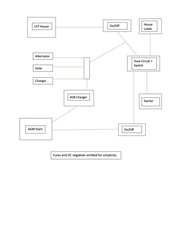 From my perspective, the silly way to install a LFP is often touted in the forums. In this method the alternator's output is directed to the LA start battery and the LFP bank is charged with a Battery to Battery (B2B, or DC-DC) charger. This protects the alternator because a LA battery has a limited charge acceptance rate and will keep the battery from overheating. This method is silly because the best feature of an LFP battery, high charge acceptance, is not used. Instead the LFP battery is charged at 30 amps regardless of the bank's size. This is no better than an AGM or FLA battery.