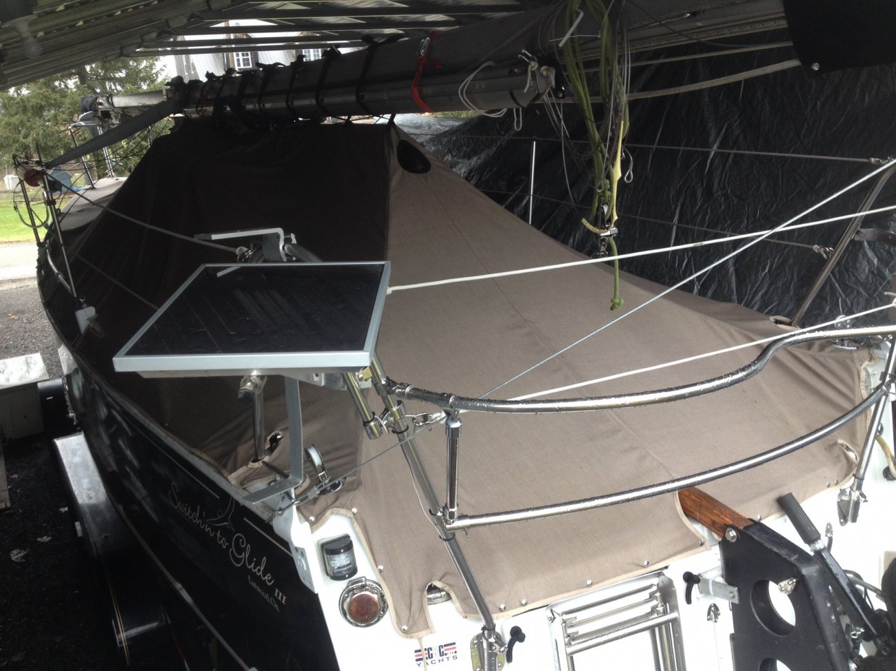 Charles - fabrication details...Sailrite Ultrafeed, Sunguard UV B92 thread, all Sunbrella Sand Tweed, Sunbrella binding, Stainless Steel snaps and studs, #10 YKK marine zippers, poly webbing straps with sewn in Keder Welt which slide into aluminum awning tracks riveted in place onto each side of my boom.