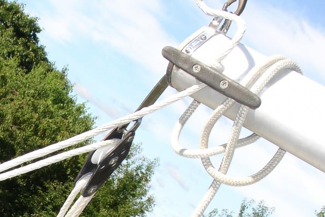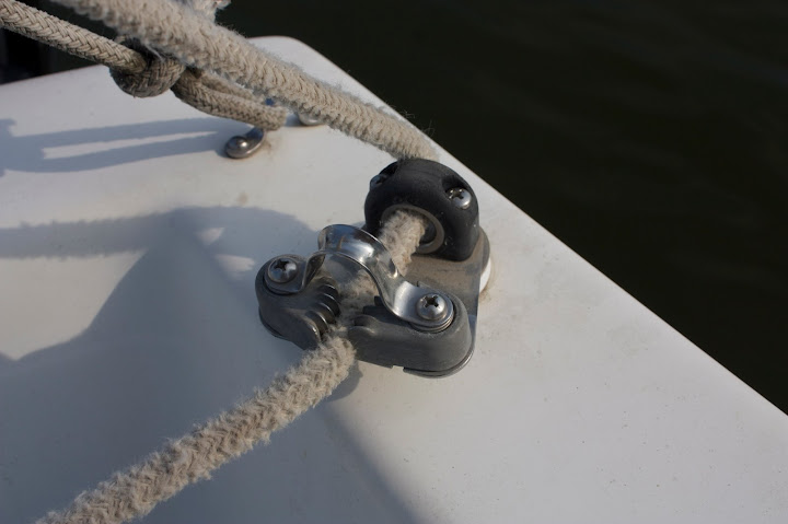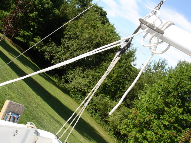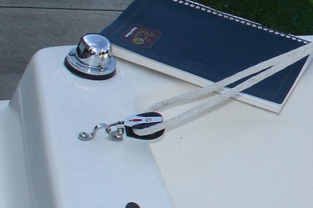 In everyone's estimation, is this correct? I believe I have the sheet running from eye strap to small pulley on traveler block to swivel block to large pulley on traveler block directly to the clam cleat. I don't have a second swivel block adjacent to the clam cleat. I think it would work to provide much less friction if I had one, but I'm not sure how to rig it. Does anyone have any thoughts (or photos) on how to attach the block to the cleat (there is currently just an eyelet adjacent to the cleat) and on the correct way to run the sheet through the traveler block? Thanks very much.