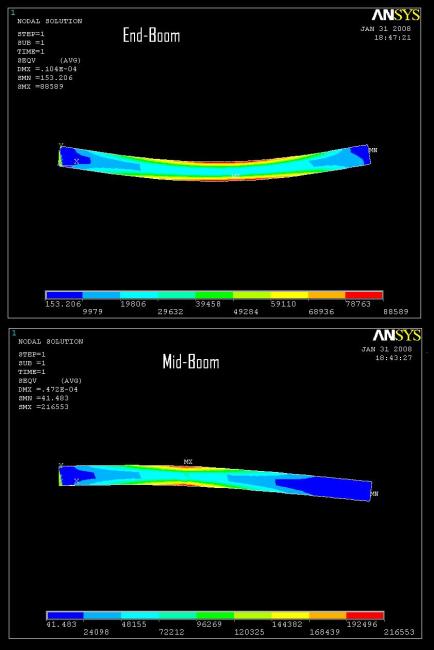Think about the boom as being flexible (they are, and the boom will flex before it breaks). With mid boom sheeting, you pull at the midpoint, but the sail is hanging out and has more mechanical advantage than you do. In a hard blow, the boom aft of the sheet will want to curl to windward Since I'm in class, I did a silly little experiment with some software. The wind pressure is downward, and greater near the front of the boom than the rear. The front (left) is fixed, and the sheeting position is fixed, while the rest of the boom is slightly flexibile. The numbers don't actually mean anything, but I didn't change the force acting on the boom - just the point where i was keeping the boom in position. Note the relative maximum stress goes up by about 3 - with end-boom sheeting the forces are a lot more disributed, while with mid-boom theyre focused at the sheet attachment.