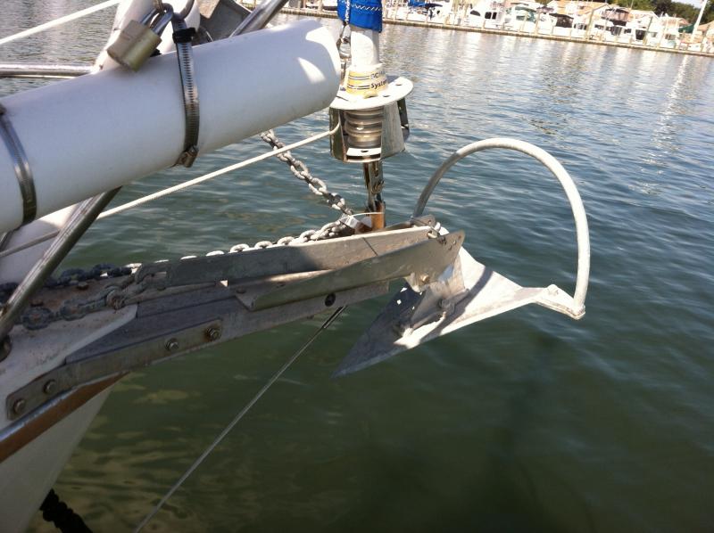 The bungee to port supports the lifted anchor locker lid. Note the capture pin through the roller and anchor.