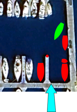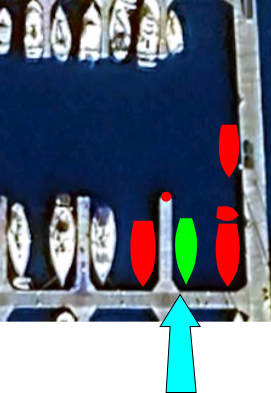 Curious to hear other ideas/strategies. (The diagram is not exactly to scale. Our boat is 32 feet, and there was about 40+ feet between the end of our finger and the tip of the blue arrow. So, it wasn't quite as tight as I made it look, but still a bit snug.)