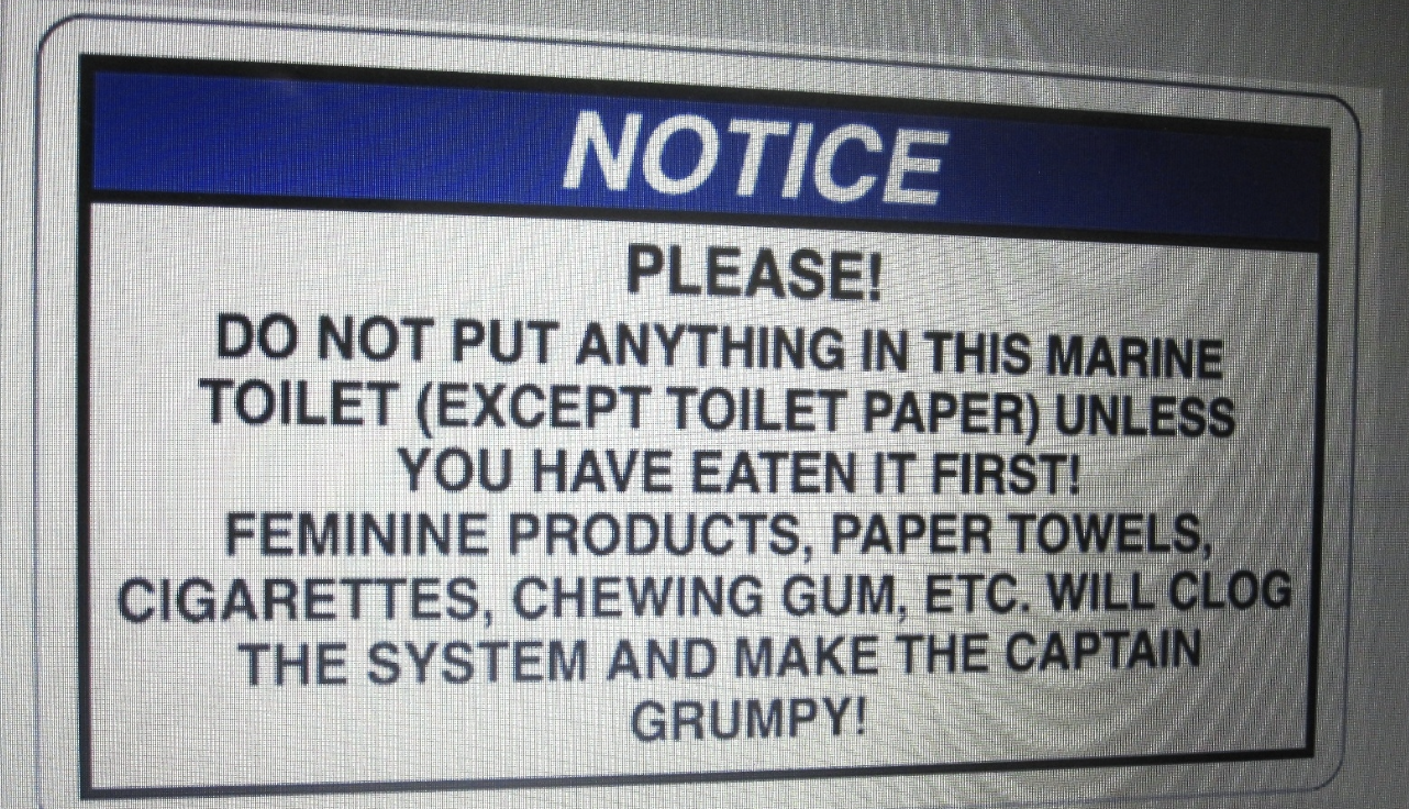 The 'attention' part is important. I did not really listen completely to the "marine head techniques" short talk on my first delivery (29 foot sailboat) a little over 40 years ago. Just once..... I violated the Other "rule" and put too much paper thru on one flush. Or, I tried to. It clogged.