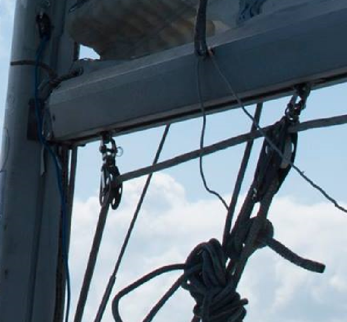 At the bottom of the mast the pulley is attached to a D- ring on the mast base.