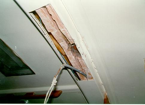 Here is a picture of how mine was when the wood above failed and the deck pushed down. You can see that crossways piece of wood had a big notch taken out of it and the post only supported the back part of it via the skin of the beam. Then the wires could go in the groove to port. But with the inadequate support it all crushed down. My solution was to put a block of aluminum with a hole drilled in the side to turn the wire to port as well as one drilled down at an angle for the wires into the settee. I got rid of the entire chunk of wood, but now realize that's not necessary. It just needs a strong support block right on top of the post that won't settle over time.