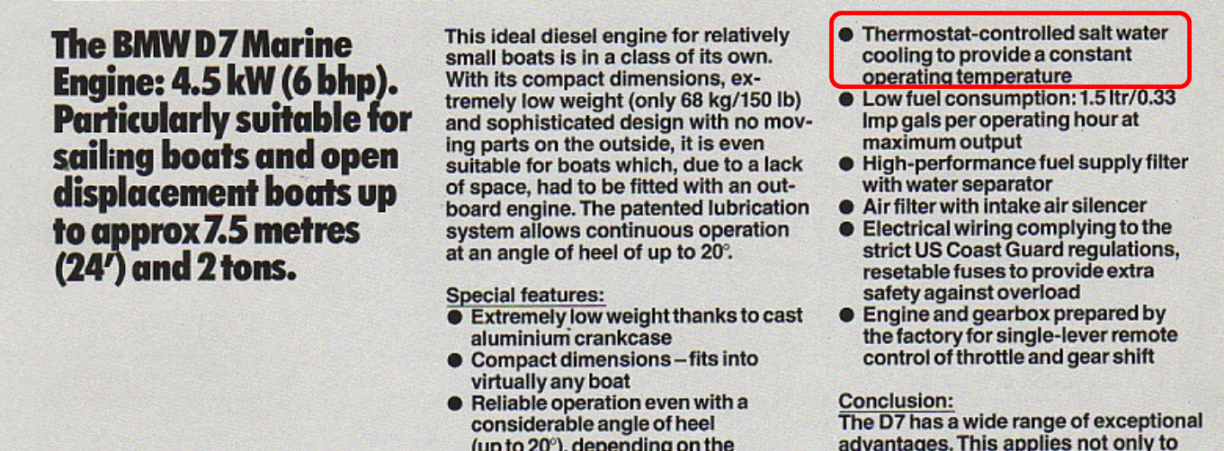 Raw water cooled engines have their problems and the 25A alternator will cut down on your luxuries for the usual reasons when you are on the hook for any time. How does the price of the BMW D7 compare to a rebuilt Yanmar 2GM 20F with 2.7 times the HP ?