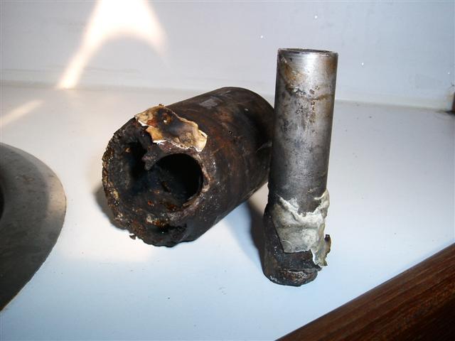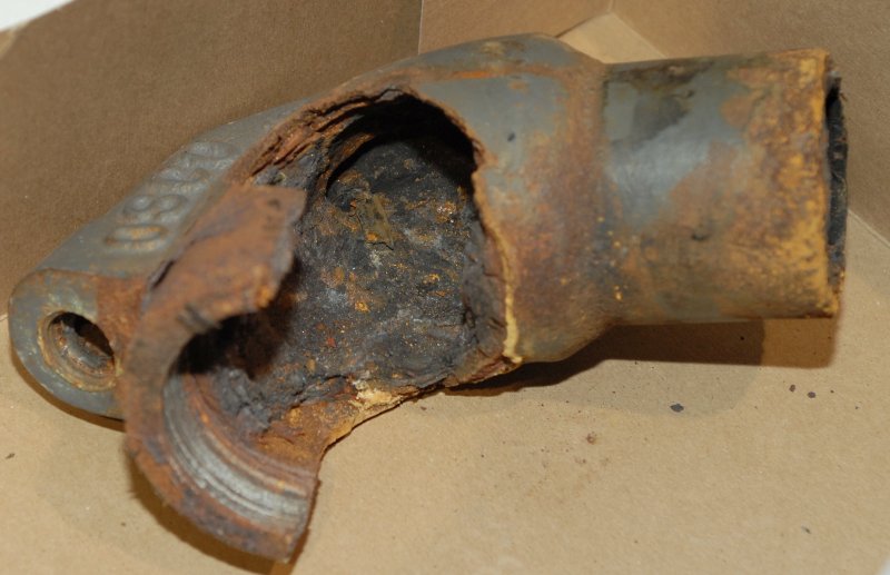 Sorry to hear that, rardi. I understand that your elbow on your engine is different than ours, but the concept is the same. This is a picture of ours after it broke. I had tried the "Marine Tex on the outside hopin' it would keep it together" trick, but it didn't. It failed catastrophically a few months later. Thing is, they rot from the inside out, so what you're seeing is the LAST indication that it's gonna let go, no one knows how soon. I sailed back to my slip that day. Don't know what your dock arrangement is and given the winds some days whether you're in a position to do that.