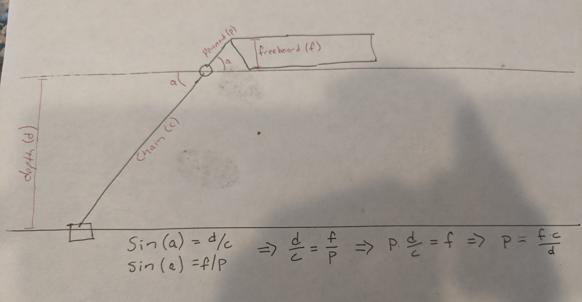 SO the conclusion seems to bear out thae guidance that the pendant length should be 2 to 2 1/2 times the freeboard height (at the chocks) where the multiplier (2 or 2 1/2) is the same multiplier used to determine the scope of the chain.