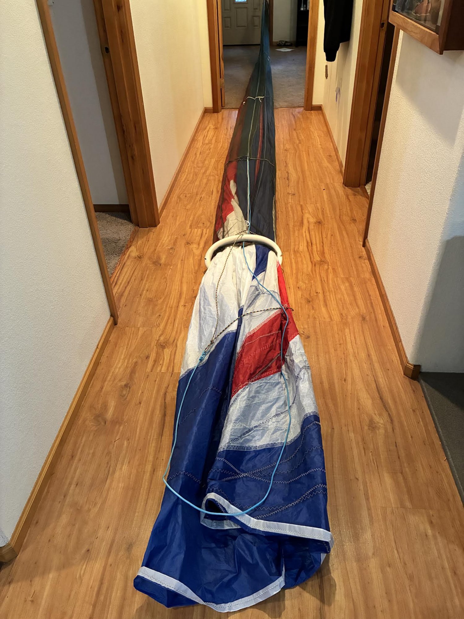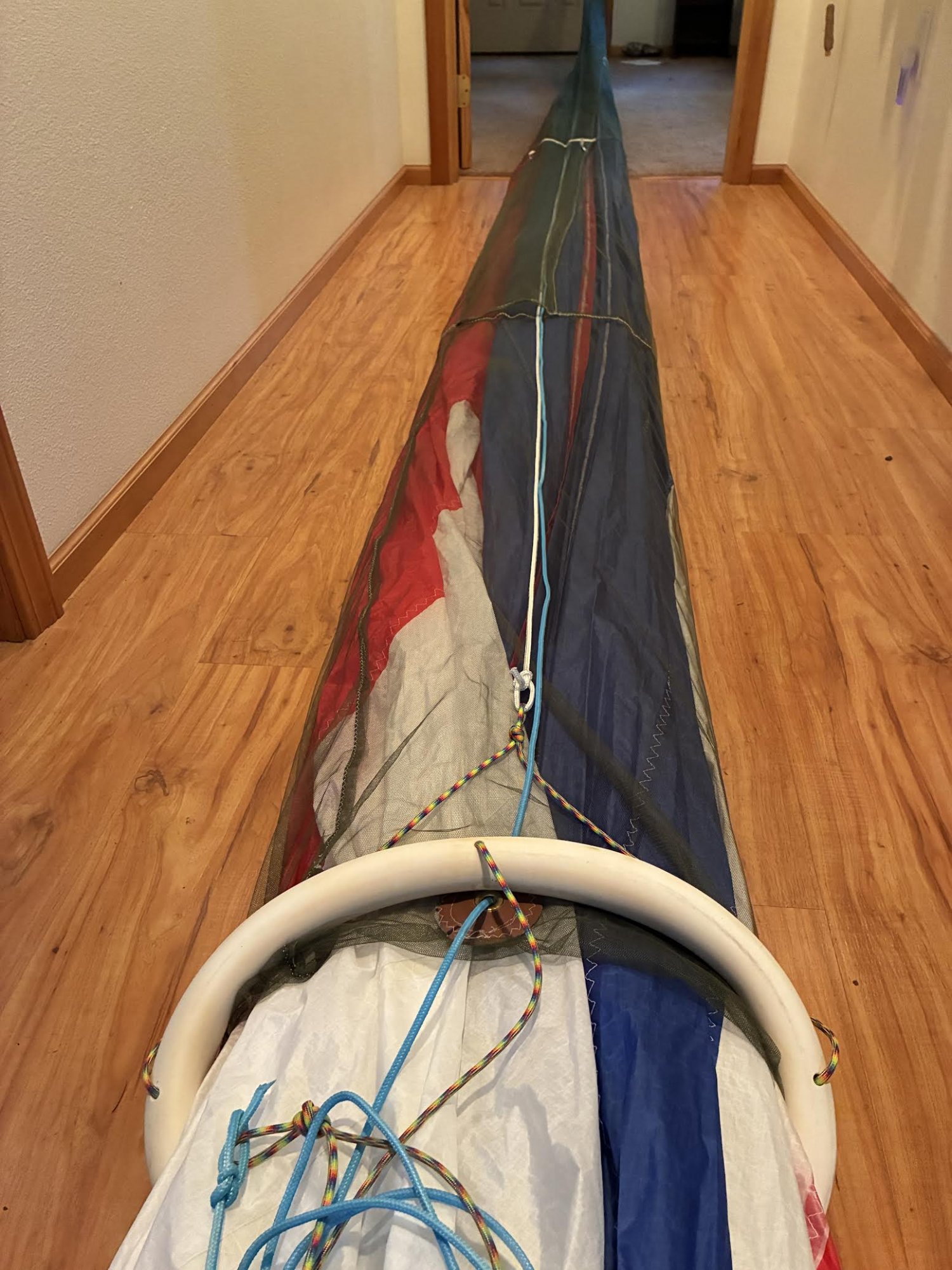 One of my winter goals was to get set up to fly an asymmetrical spinnaker I’ve had gathering dust for a couple years. I’m just a poor boy, and home made is generally my only option, so a couple weeks ago I fabricated a shorty bow sprit for my Merit 22, and this week I’ve been working on a home brew sock to make solo use easier for an old man. the hardest part was creating a decent funnel. I used up a dozen feet of pvc pipe learning how to heat and form it around my fabricated wood form but I finally did get what I think came out pretty well. then I sewed up a sleeve out of mosquito netting and a bit of hardware I had laying around. Now if it just works as well on the boat as it does laid out down my hallway I’ll be a happy camper ;). thoughts? I launched it out of a bag, in very light wind, on my Mac 25 a few years ago but have never used a sock before. hopefully I learned enough by watching a bunch of videos to not die :laugh:.