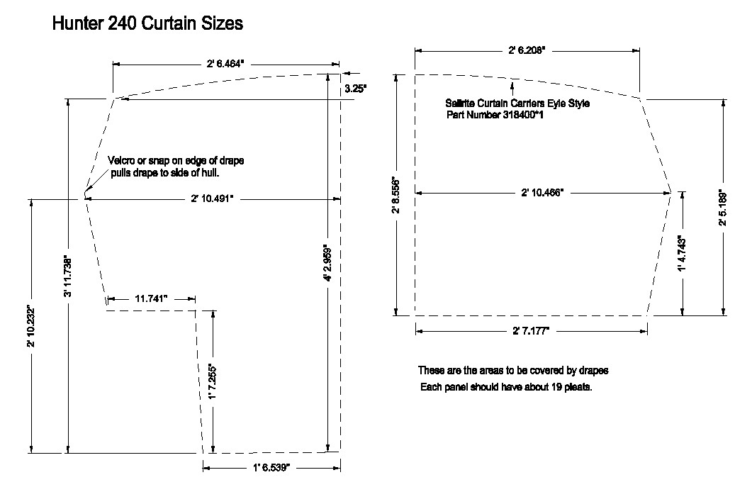 I am restarting my quest for curtains for my Hunter 240. I have taken all the measurement in the cabin and reviewed pictures of about a dozen other boat interiors. I am having to guess at the number of pinch pleats in each panel. Before I contract with a company to produce these I wanted to ask one more time if anyone has an old set that he is willing to part with. I would much rather measure an existing pair than having to do this from scratch. I will buy a used set in any condition if you have them.