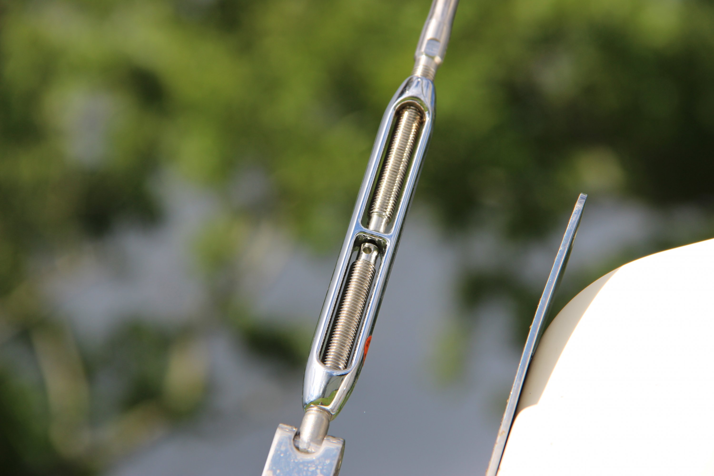 I will note that I have the aft side stays extended out as far as they will go to make the mast base sit flat on the base plate. In doing this the forestay turnbuckle must be taken up completely and even then is not quite tight enough...