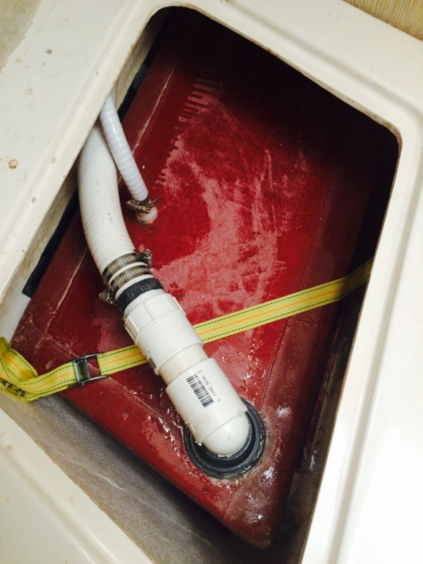 Two things I don't have photos of: the shower seat repair detail and the tank tie-down detail. I used the same 1/4" FRP that I used to build the tank and cut in 2" wide strips to backer-block the shower seat joint. Screwed together at 4" spacing, the joint is very strong. When I first planned out the project, I feared cutting out the seat. Now that it's done, I'm not unhappy with the way it turned out. The seat HAD to come out to remove the old tank. I can hide the scars with teak molding someday, probably never. Just seal the seam with latex caulk.