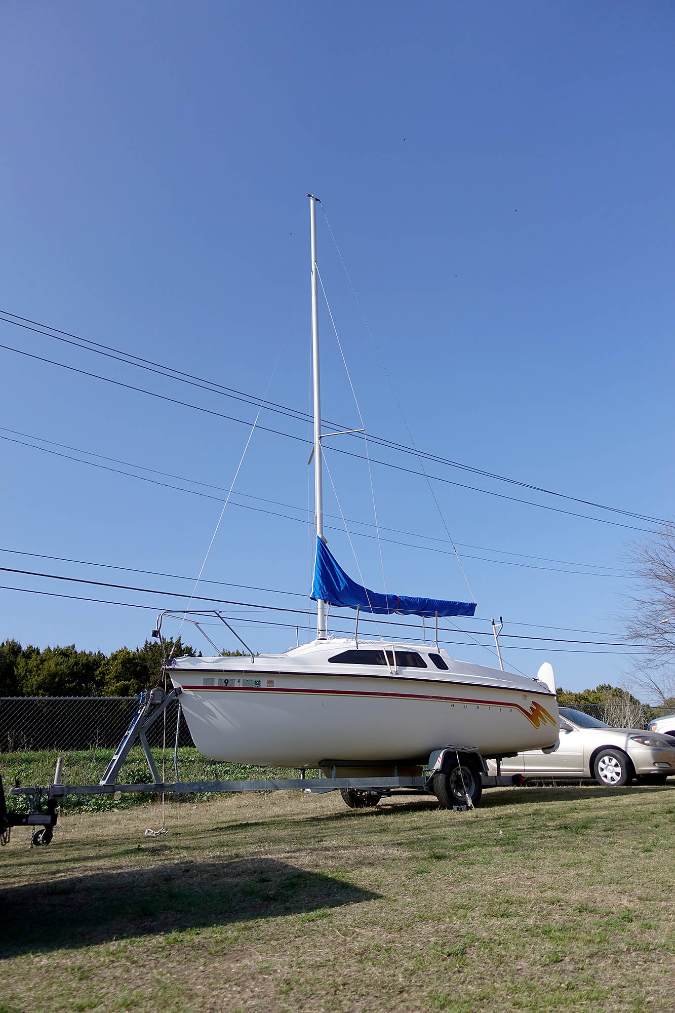 A couple of weeks ago I bought this old Hunter 19-2. I never even heard of Hunter. Then in my searches, this one pops up. It was in the middle of nowheres, so I'm guessing that is why nobody went out there to look at it. Since I was already planning on getting an old small sailboat, I was already planning on doing all the normal repairs like sealing all the leaking windows, and restoring all the wood and cushions, plus replacing all the normal stuff that normally wears out. This one looks like it has been sitting since at least 2014, since that is what the trailer tag reads, and the boat tag reads 2009. The boat was filthy, but the bottom of the hull looked like new, so I don't think it has been in the water much. The inside was pretty dirty, but the nice thing was, there is no wood to restore, and the windows didn't leak. The only thing was that it was dirty, mainly from just seating. The owner said it had a brand new 6hp Tohatsu 4 stroke outboard, with only 2 hours on it. So I basically bought it for the outboard. The trailer looked in excellent condition. So we made a deal. I had to get two new tires for the trailer, and I pulled it home. The bearings where fine, and most of the lights worked.