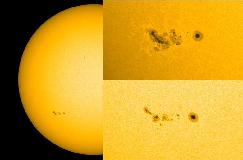 NOAA 2781 rotated into view on 2 November, quickly increasing in size to become the largest sunspot group so far this solar cycle. At its maximum on 6 November, its area was the equivalent of nearly 3 times the surface area of the Earth (NOAA). The changes in the sunspot group were quite dramatic. Images underneath shows the group in white light (SDO/HMI , SDO | Solar Dynamics Observatory ) on 7 November, with the insets (zoom) early on 6 (top) and late on 8 (bottom) November highlighting the significant decay of the region, in particular in the middle and trailing portion. Clips are available at NOAA 2781 showing off | STCE