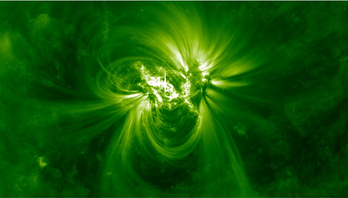 Despite its size and magnetic complexity, the group produced only C-class ("common") flares. The largest were a C7 flare early on 5 November and a C5 event on 8 November. The images in extreme ultraviolet (EUV) underneath show both flares. For the C7 flare, views in two filters are compared. AIA 171 (left) shows the flaring event at "moderate" temperatures of about 700.000 degrees, and AIA 131 (right) provides a high temperature view at several million degrees. In AIA 171, peak brightness is a few minutes after AIA 131, and it provides a finer view of the (few) post-flare coronal loops. The C5 flare is highly zoomed and is shown in the green component of AIA 171. No obvious coronal mass ejections were associated with these flares.​
