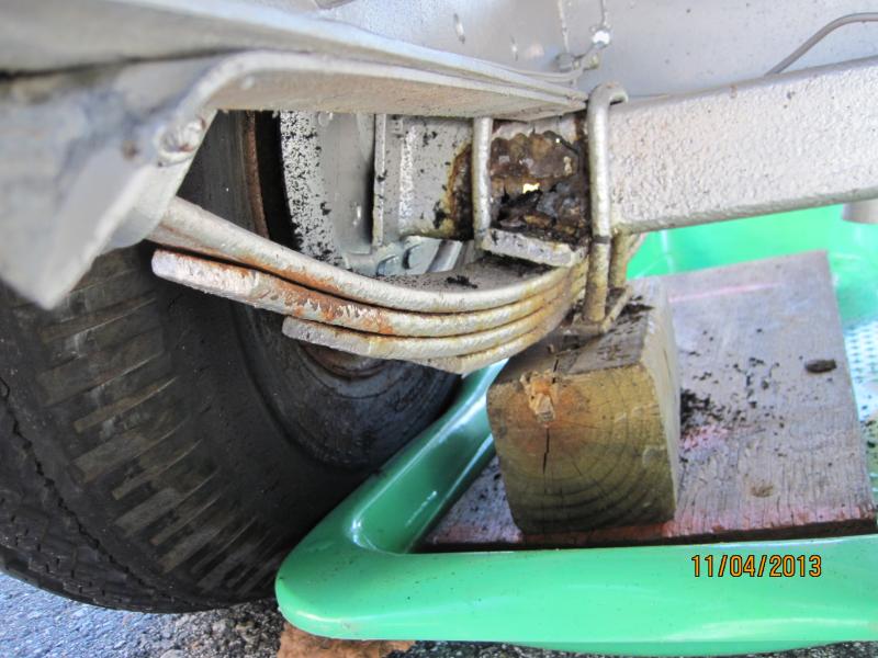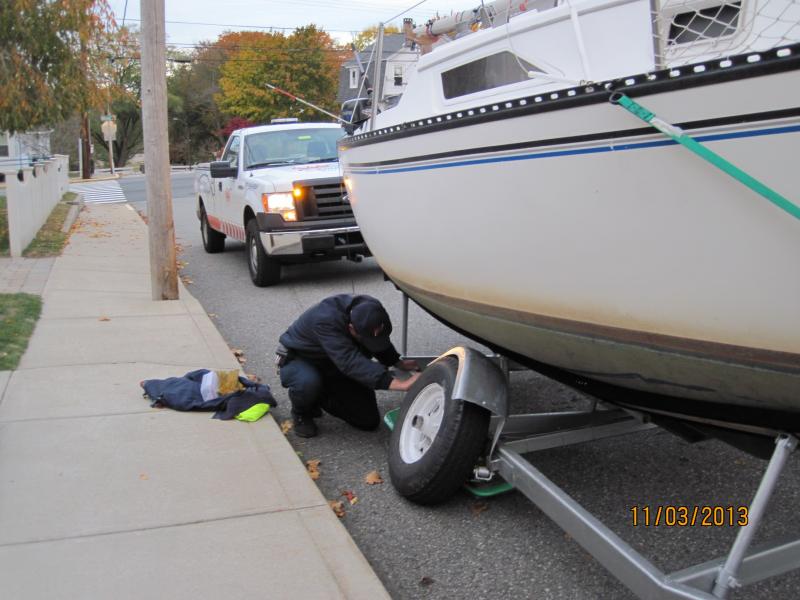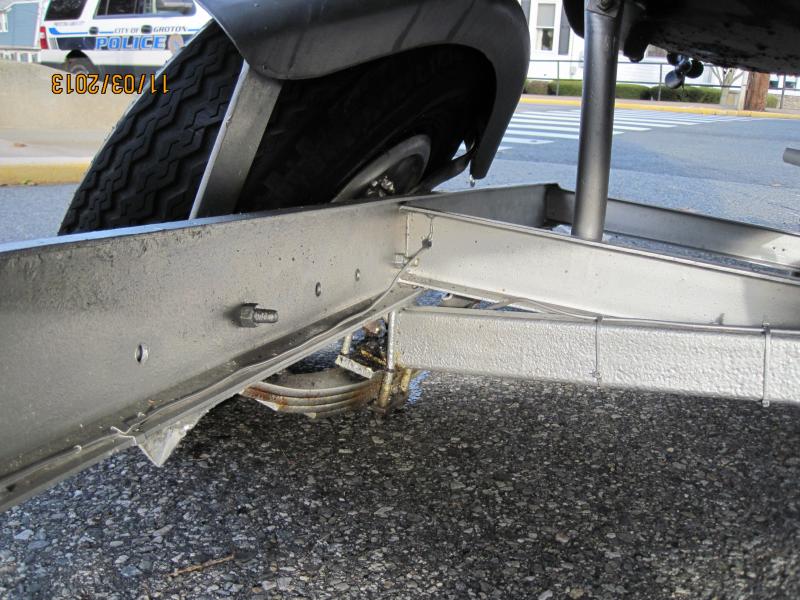 Upon further inspection, yes you may have guessed it, the axle failed... right under the leaf spring u-bolts area. It had rusted through inside to out. I kept up with visible rust control & painting, and the trailer only saw salt water 2x / year: launch and haul out. I have yet to take any long trips with it, and am content to sail on Long Island, Fishers Is, and Block Is sounds. Saying something like 'OMG' comes to mind now, but what I ACTUALLY said, I'll leave to your imagination. And to think that I was only ~200 yards from my street... Home sweet home was beckoning to me and my now lame trailer.
