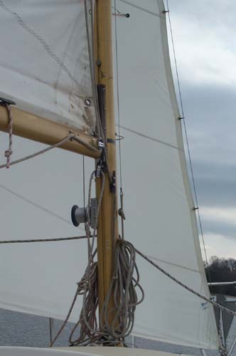 Guys I have both and am attaching a couple of photos. Ron, the peice you describe is how my vang is attached. Or I should say was attached as I found the ball broken of the short (6 inch) piece of cable a couple of weeks ago. I have no idea how it broke but it happened while on the mooring. I have no idea where to find a replacement but will be talking to Rudy soon about other supplies, I'll see if he has one. I don't have the gear to swag a new end on. I may have that gear soon. I also have a downhaul attached at the mast end of the boom. the photos show an eye attached with a block hanging the line runs from the base of the mast up to the block and back down to a cam cleat. I have no idea where this rig came from or who put it there. It was there when I bought the boat.
