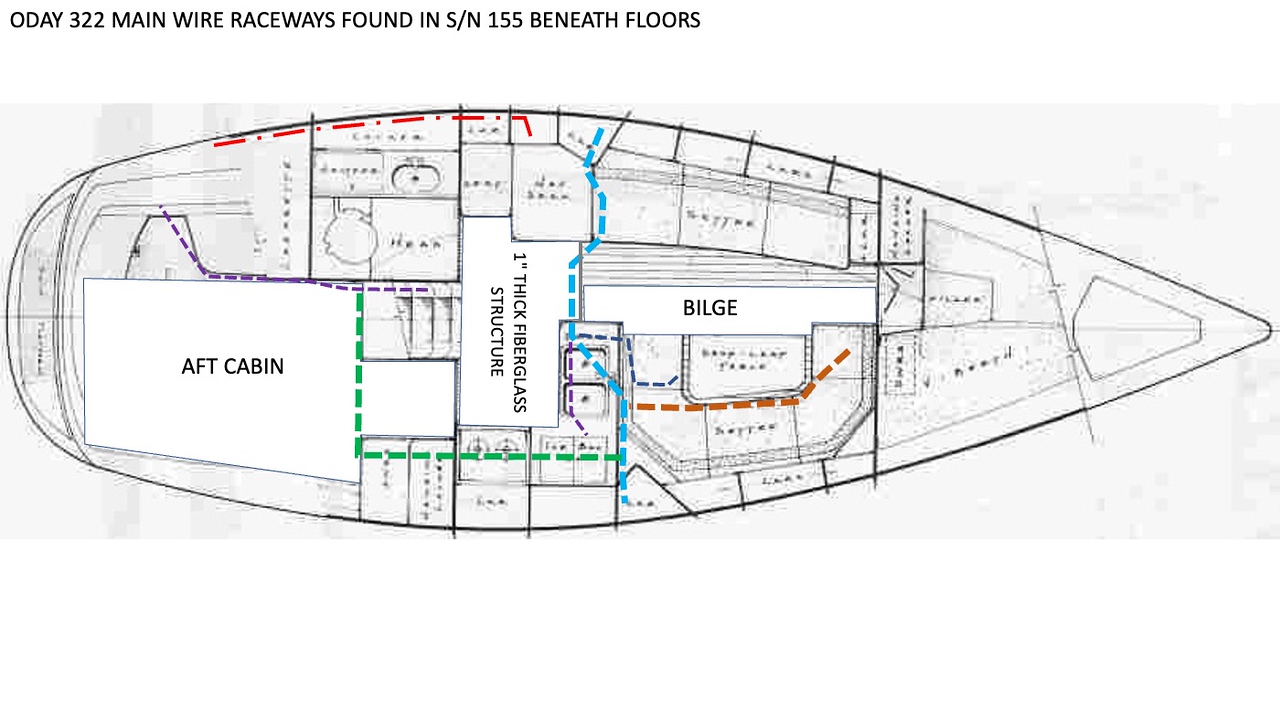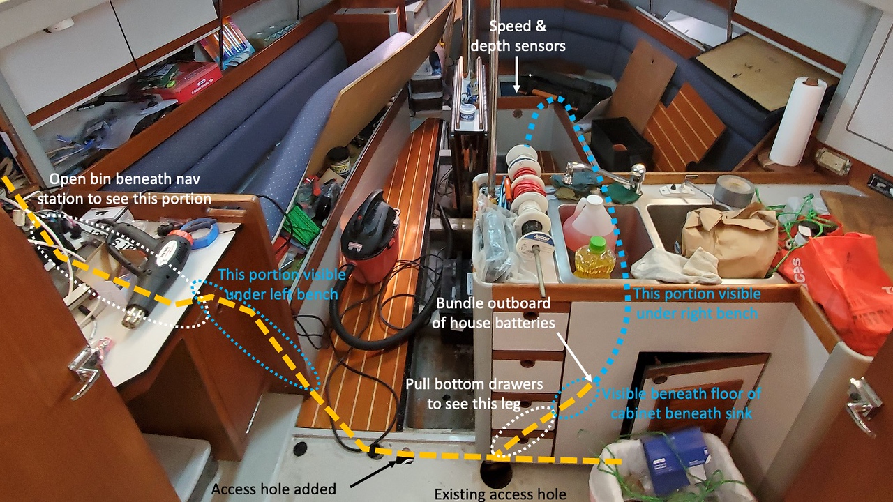 To add wires and a cable to the main left-right route I had to add an access at the place shown in the first photo. Be careful NOT to go past the bottom of the structural floor due to risk of cutting into wires and water hoses. The new wires had to run from right to left due to interference points.