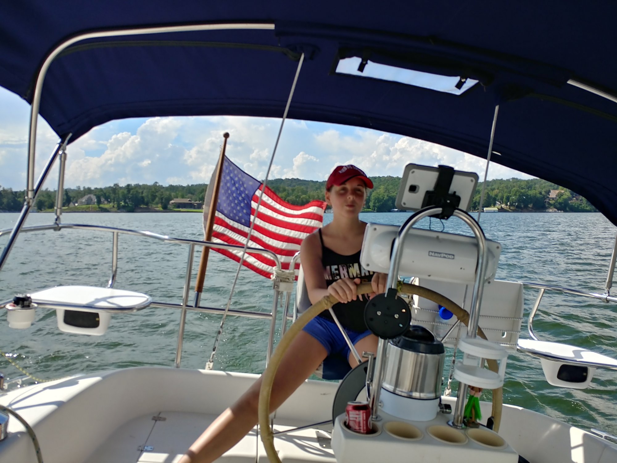 My daughter was on helm and calling our tacks, watching our heading, depth and position, Dad was on sail handling. Our trim wasn't great and I really should have started with the jib reefed in. I also messed up and had the jib cars set to far forward initially on our first tack. Full sail under the gust we would spill the sails and my daughterwould pinch us up to depower. it was an exciting ride for us for sure and good that Mom did not come out. We never lost control or felt like she was going to round up. We did reef in the jib eventually and that did help.