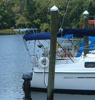 Lynn,Here's my setup. The Unisolar 32 flexible panel is supported by an aluminum frame 18" by 8 feet, mounted on two 7/8" aluminum poles bracketed to the bimini support legs. The brackets are standard bimini hardware. I wish I had a better picture. The wire goes down to the sternrail seat and into the gas tank well. It passes thru the bulkhead by way of the hole for the motor leads. I have a 105 ah AGM battery and a solar panel regulator to prevent overcharging.