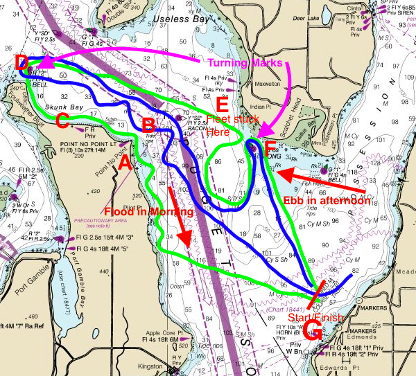 Big Mistake (I think): There was a Cal 40 beating up the main channel and we assumed he was in our class and started to duke it out with him and were keeping up. Point "B" Our class (and the rest of the fleet) went into Skunk Bay (Point "C") where the surface was like glass and because our boat speed and wind was good we kept dueling it out with the Cal 40, but against a really strong flood.