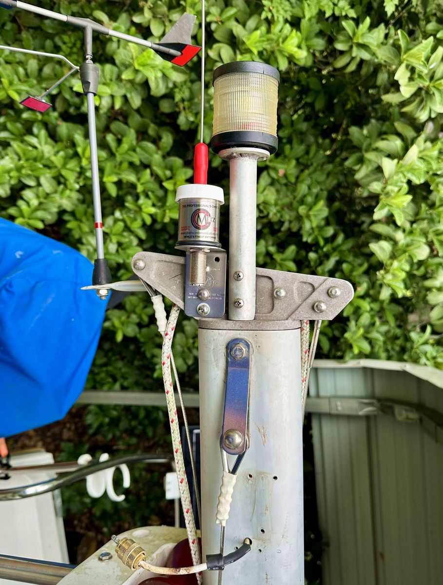 This is my old antenna, which I am replacing. As you can see, the bottom 12'' do not clear above the light and the windex. I could shorten the masthead light and/or move it to the other side, perhaps as much as 3" further away from the antenna?