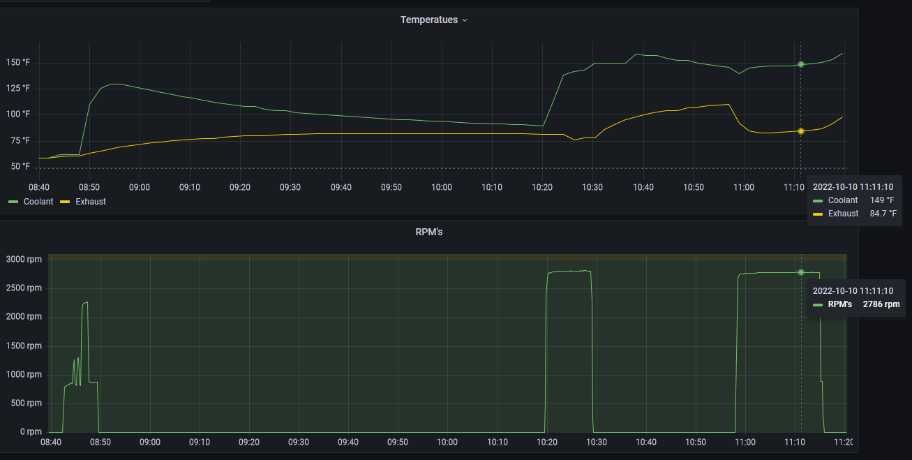 the problem I’m having with my onboard pi devices is that they don’t like ungraceful shutdowns and get corrupted, loose settings etc. Mine is powered via the nmea2000 backbone using a pican-m hat, so simply shuts off when it open the instruments breaker. It gets confused after a few cycles. I need to add a large capacitor and some voltage sensing logic so it will gracefully shut down on loss of powerOr you can go the more DIY way and attach sensors to get some data directly from the engine and log it with an Arduino or Raspberry Pi. I've attached a couple temperature sensors to my thermostat housing and exhaust elbow, and tapped into the alternator tachometer wire to sense RPM's. All the data goes to a Raspberry Pi on the boat, and a Yacht Devices USB gateway puts that data on my NMEA network so I can see it on the chartplotter. Plus the Pi saves all the data and some dashboards visualize it. Here's the data from one morning of sailing and motoring for example: