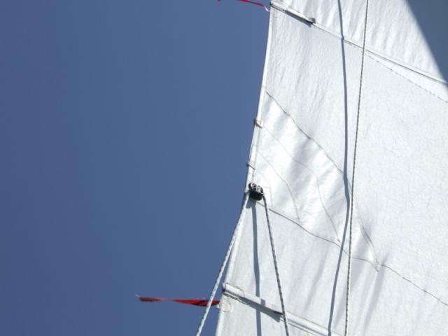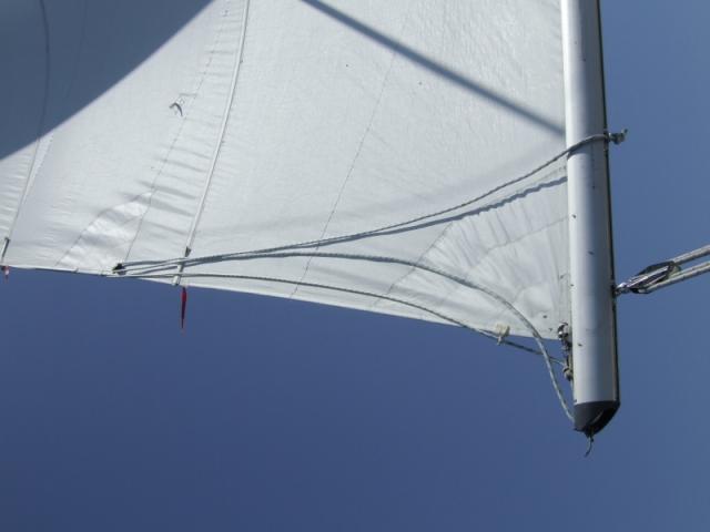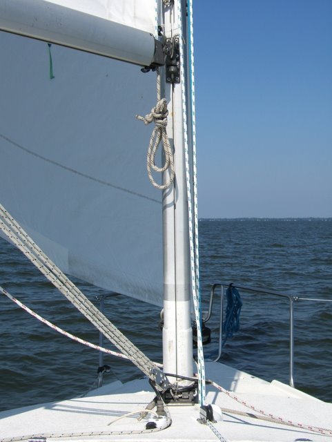 Ideally you will then have 2 short lines(3') in the mainsail grommets which should now be at the height of the boom. You'd use these to roll up and stow the baggy extra sail material that'd be hanging below the boom(don't over tighten these lines or the main will tear them out while underway).