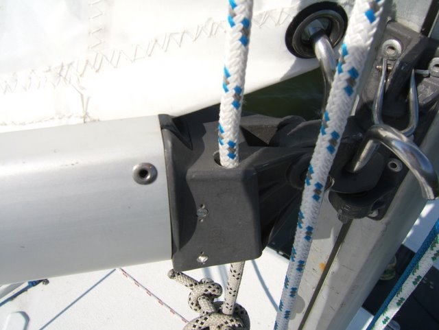 Ah yes, the single line reef mod sorta like this Harkin diagram, except utilizing the internal boom blocks. Two small blocks on the sail are certainly needed on the 260/26. I also did this simple mod and it's a nice perk. Great pics to tell the tale.