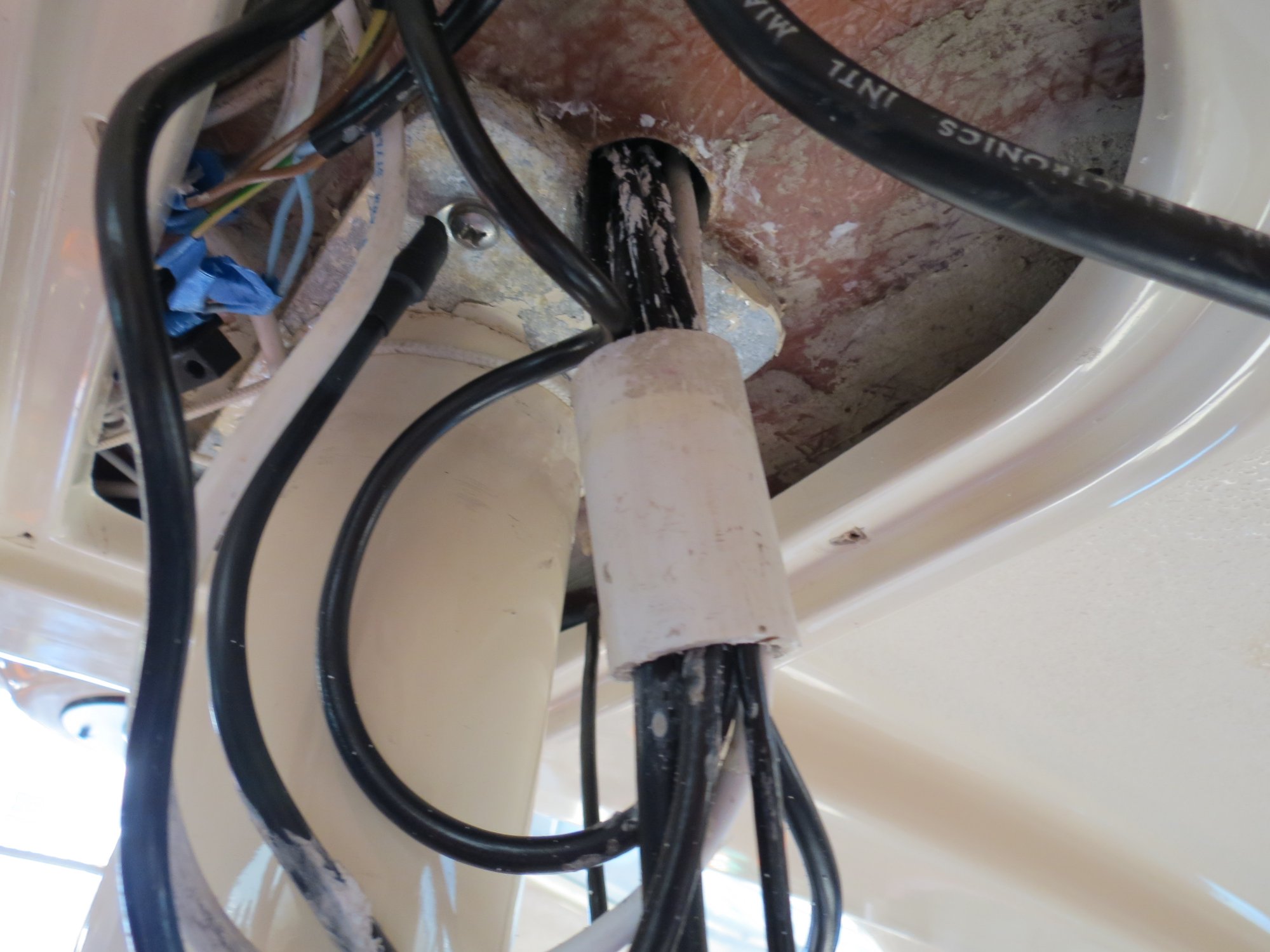 From my photo archives- The wire bundle passes through a short PVC tube. The top of the tube is about 1-1.5" above the base of the mast step and is about 0.5" below the fiberglass deck at the support inside the salon. I think the PVC tube is about 1.5" in diameter, but you should check that measurement if you are going to replace the tube with a longer one. I would replace with a tube that is 2-3" above the mast step. This PVC tube is caulked into the hole and the wire bundle is caulked into the tube itself.Yes, can you please post/dm me that? I am likely going to be taking the mast down soon and want to add this to the list.