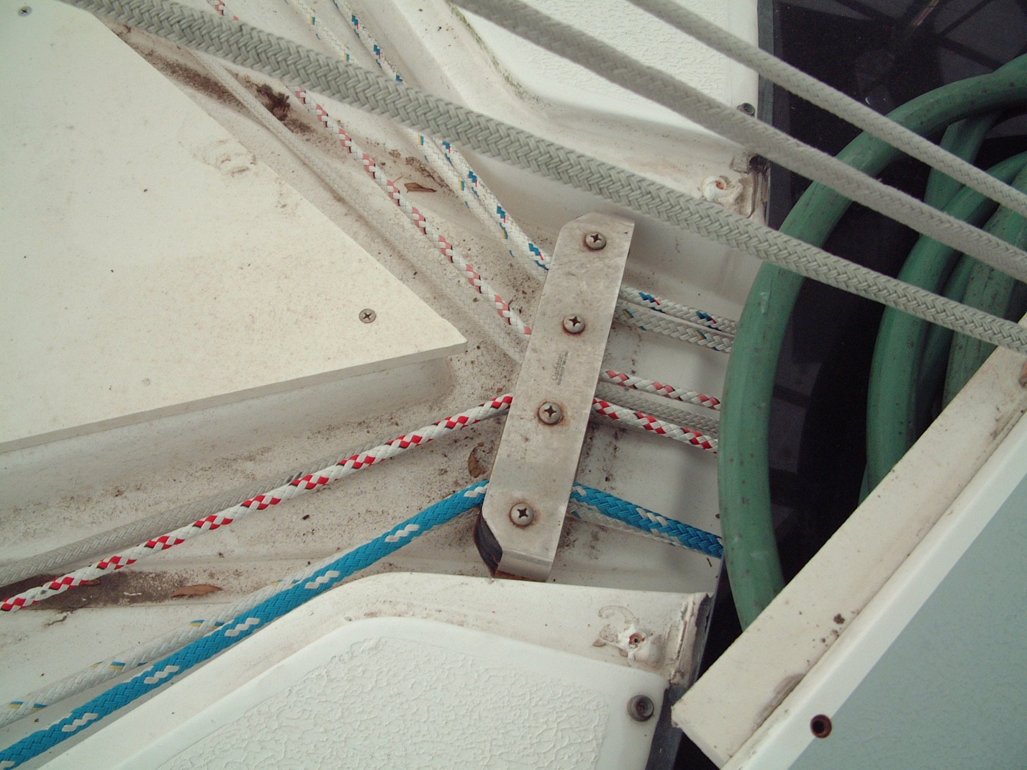 The other spot where water can get into the cabin top and leak from the cover plate around the mast is from the screws that secure the line organizer cover. Remove the cover and clean the area by the screws. Apply caulk to the screw holes and to the screws themselves and replace. The third picture below shows the two forward screw holes before cleaning.