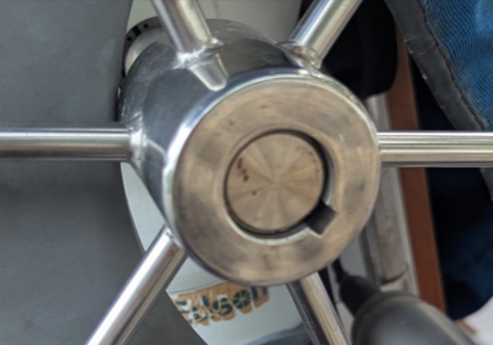 Update: I heard back from someone knowledgeable on this setup from Edson. Looks like my Edson wheel is mounted directly onto a 1” straight shaft with no retaining nut—just a keyway. What I’m seeing in the center of the hub is actually the shaft itself.
