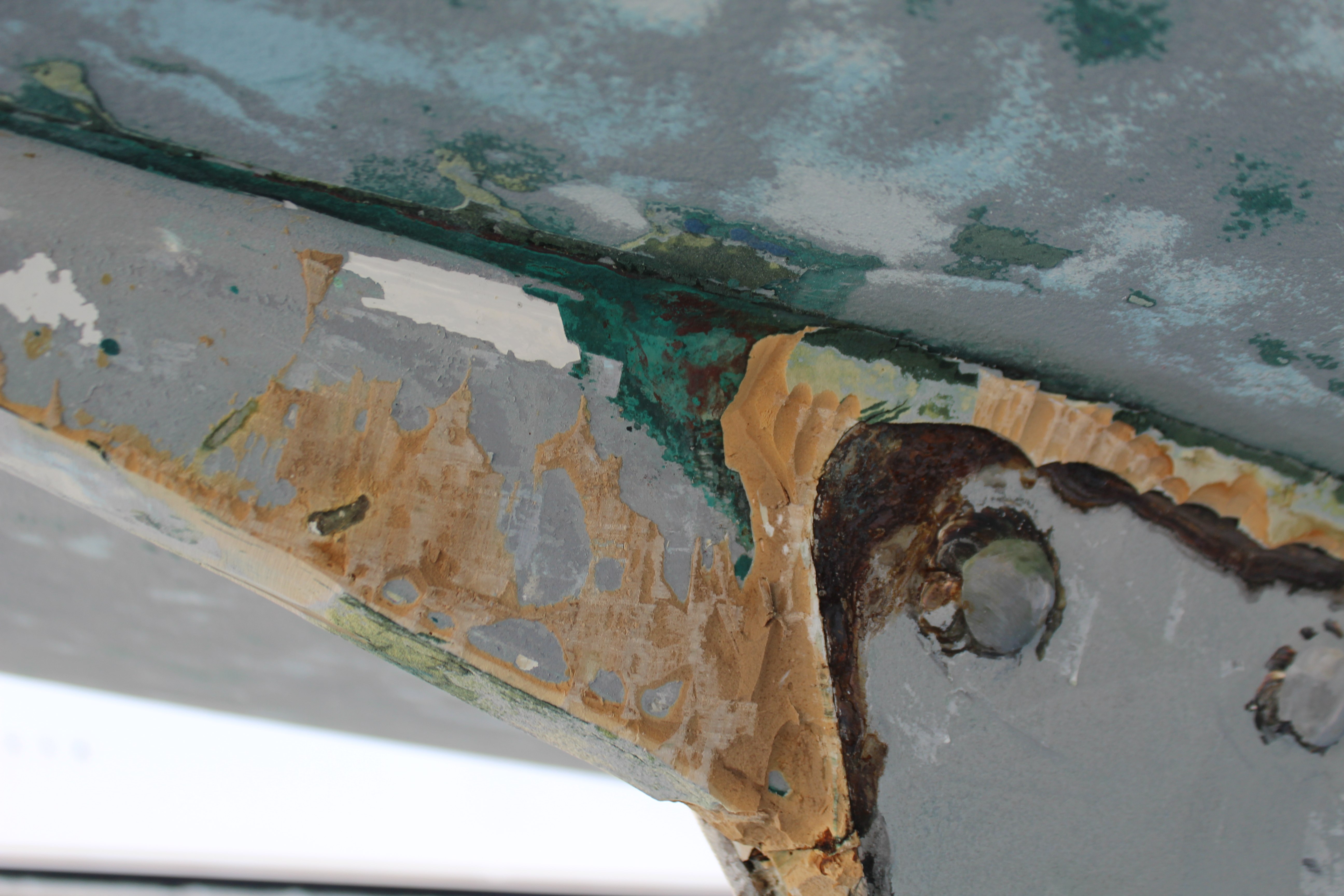 That's an area that was covered with filler that had been applied over bottom paint! Which explains the rust under the filler