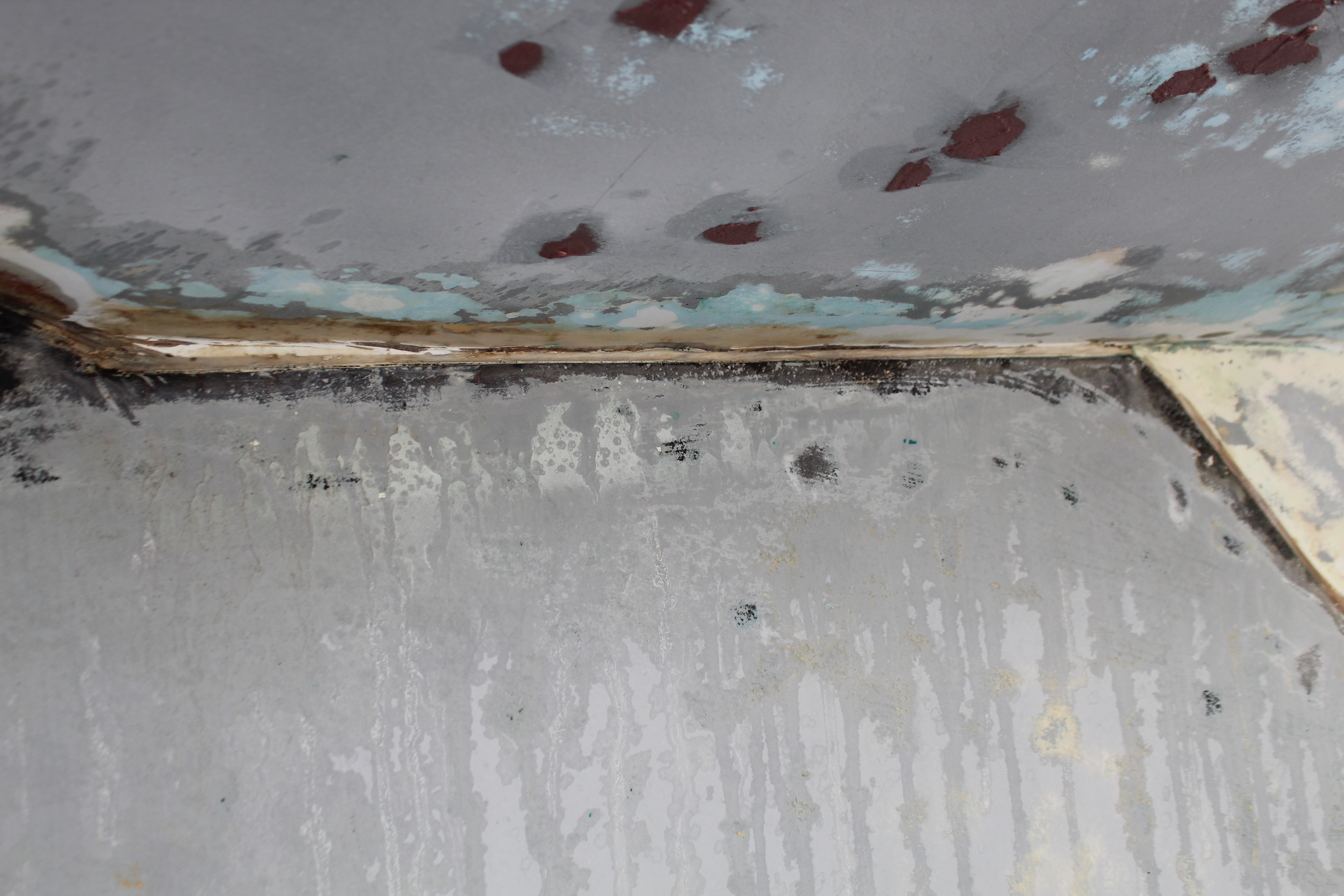 The area outlined in red was all filler before, completely covering the actual joint. I will first fill the joint (now clean and properly prepped and rust fixed!) with G-Flex, then build up alternating layers of 1708 and chopped strand mat to fill until close, then final fairing for good looks.