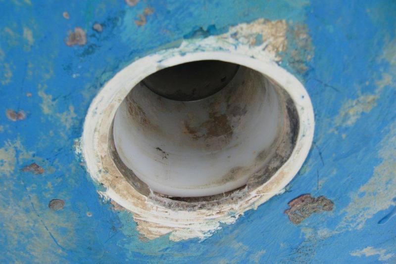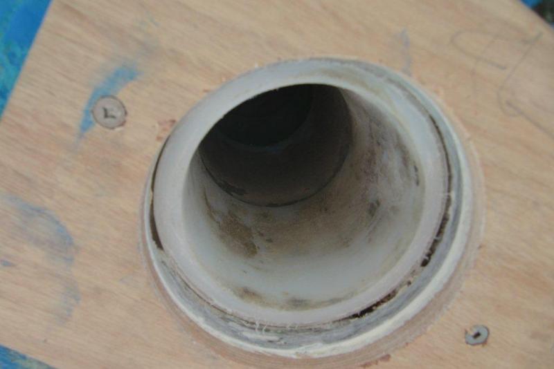 Here are some photos I took of the job. The first ones show the old rudder bearing in place. I chipped away at the fiberglass just a bit to show the overhang over the bearing. The rudder shaft photo shows where the bearing was stuck on the shaft and rotated along with it. The photos of the rudder shaft housing show the parallel lines of the epoxy where it originally affixed the bearing to the housing. The photos also show that the housing is neither round nor well filled with fiberglass; significant voids existed. Two of the photos showed how we screwed a piece of wood over the rudder hole and used a hole saw to drill out the fiberglass from under the bearing. Finally a photo shows the laminate piece we glassed into place under the bearing after the bearing was epoxied into place in the housing. The last task was to glass over the laminate and then paint over it all.