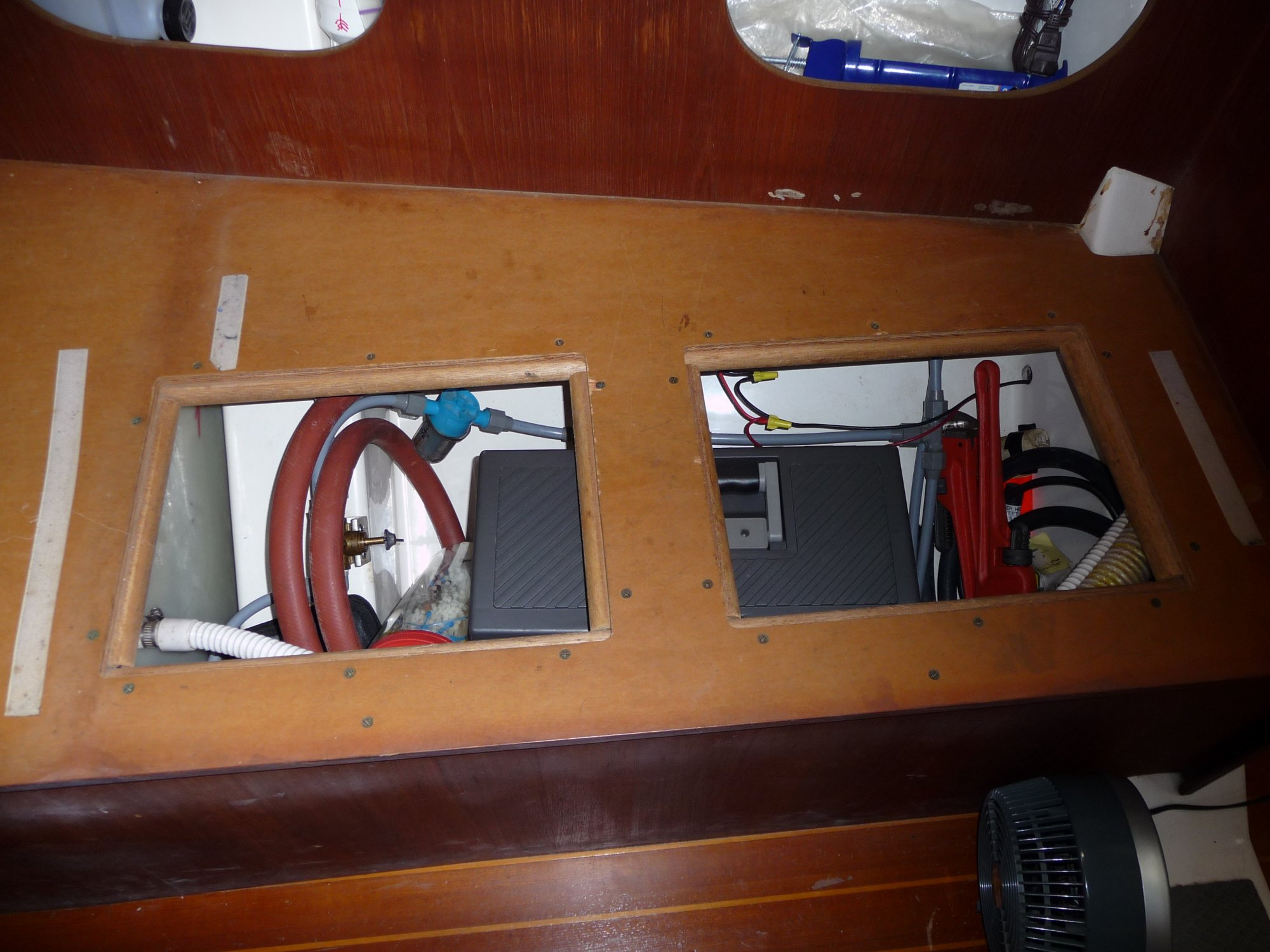 So: I"m replacing the whole platform with some 1/2" red oak plywood, which I will coat with 2 layers of epoxy to waterproof it. My question is this: should I re-use the 4 old hatch covers vs. using the plywood that I cut out of the holes as the new hatch covers? To explain: the old hatch covers have a flange on all edges, so they actually sit 1/2 on top of the platform, maybe 1/4" proud. The new wood covers would be cut-outs, so I'd have to use a plywood strip glued/screwed along the joint underneath to keep the covers from falling through. My only worry is whether this strip will be strong enough to hold the weight of a person. I'd actually prefer to use the new wood covers, since it would look better and the entire platform would be flush, but it's got to hold the weight.