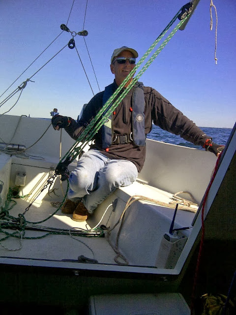 This season, I've been unlearning all the bendy mast, powerful vang, racing dinghy sail trim that I previously learned, and I've been trying to pay more attention to mainsail twist. Because I still have stock end boom sheeting and no traveller, I've been playing around with vang sheeting, and in lighter winds, using my topping lift to pull the boom up and induce twist. Actually, it's all about understanding the concepts in Don Guillette's sail trim book with regards to a traveller, and trying to translate that to vang and topping lift adjustments. I think I'm getting some decent sail shape now. I've noticed on windier days, that I can keep all three leech telltales flying, and the boat isn't heeling as much. Now for the jib, I'm torn between a short length of track on the cabin top, so I can tweak the 110% jib, or just deal with fixed position fairleads until I decide to pony up for a 135% genoa on a Schaeffer Snap-furl system, and put longer tracks on the side decks... Oh, the trouble of potting all those track fasteners along side decks...