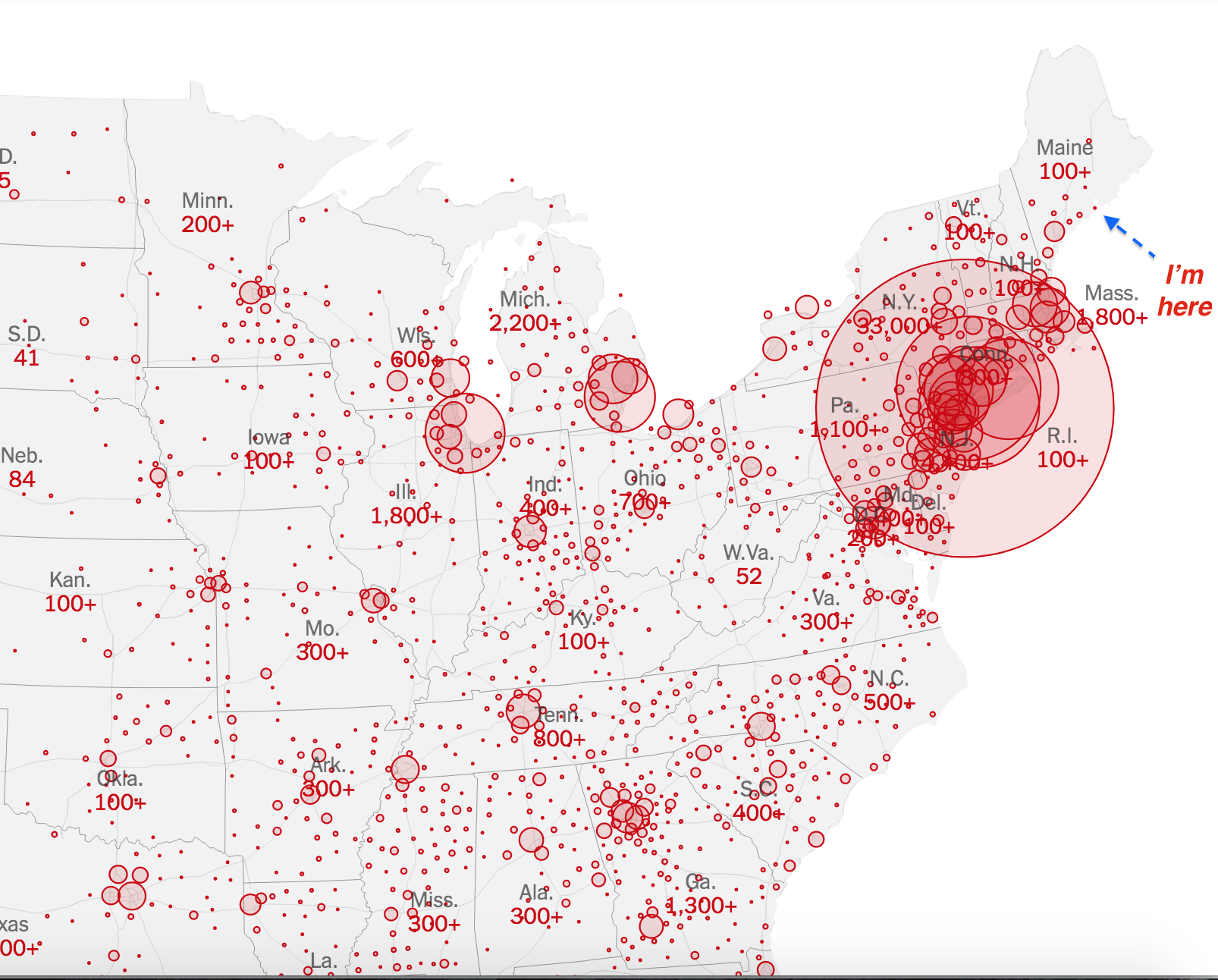 This screen shot of the latest reported positive infections shows an east coast epicenter in NYC.