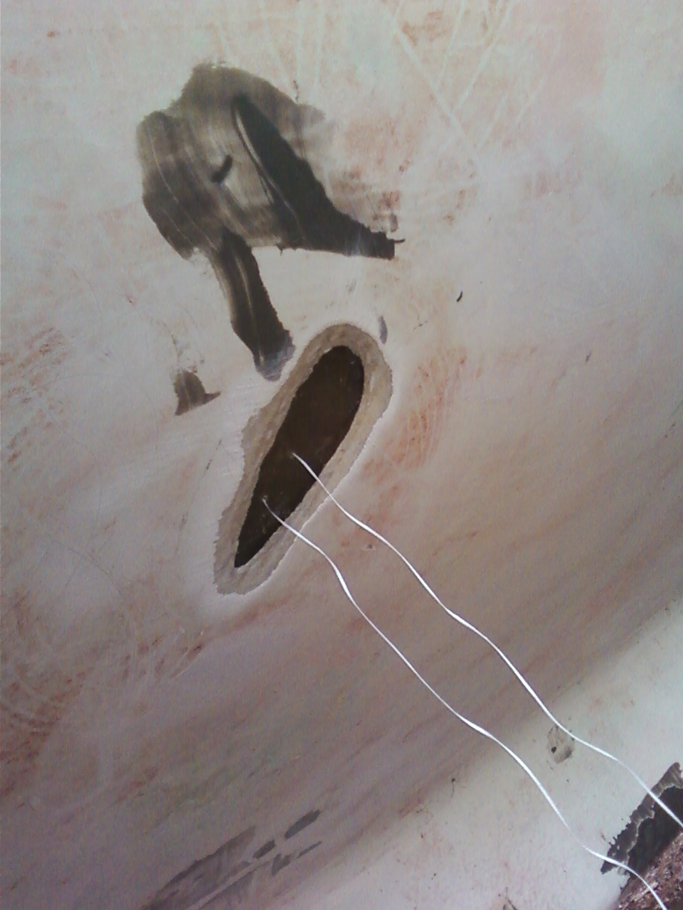 It is easier from the inside but you can do a pro job form the outside. First grind out the crack until you have undamaged cloth … then fair out the grind about 1:4 or 1:6. For example if your grind is 2 cm deep, then fair out the hole to 8 or 12 cm. You will need to glue in a backing plate. See the first few pics. I made the backing plate by laying a pice of plastic film over the hole and tracing out the hole with a sharpie. I then cut the plastice with a lip about 1/4" outside the line. I then used that plastic piece to cut six patches of fiberglass cloth with that shape and wetted them with epoxy resin stacked them and let the set. I then glued the backing plate it in place with J B Weld marine.
