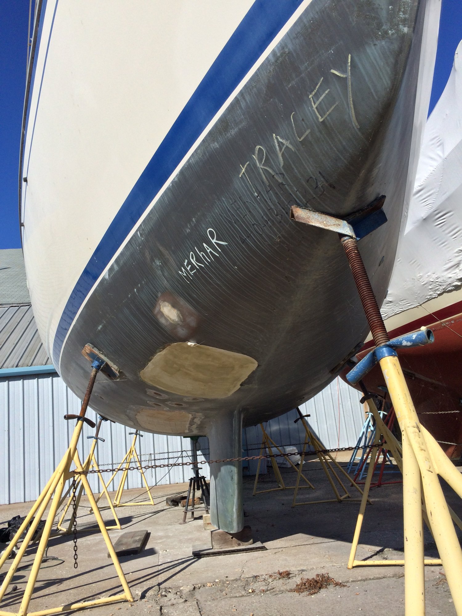 I sounded the hull and just repaired where needed. Pole was rubbing higher and water ran in thru balsa core, insurance had marina dry by cutting slits and gave it time to dry, then they relaid glass over. This all happened to Tracey, previous owner. He complained that it was not smooth enough so they blocked it out perfect and put a slippery bottom paint. In the spring when taking out of indoor heated storage he saw water weeping in two spots, thats when the insurance totaled it and wrote him a big check.