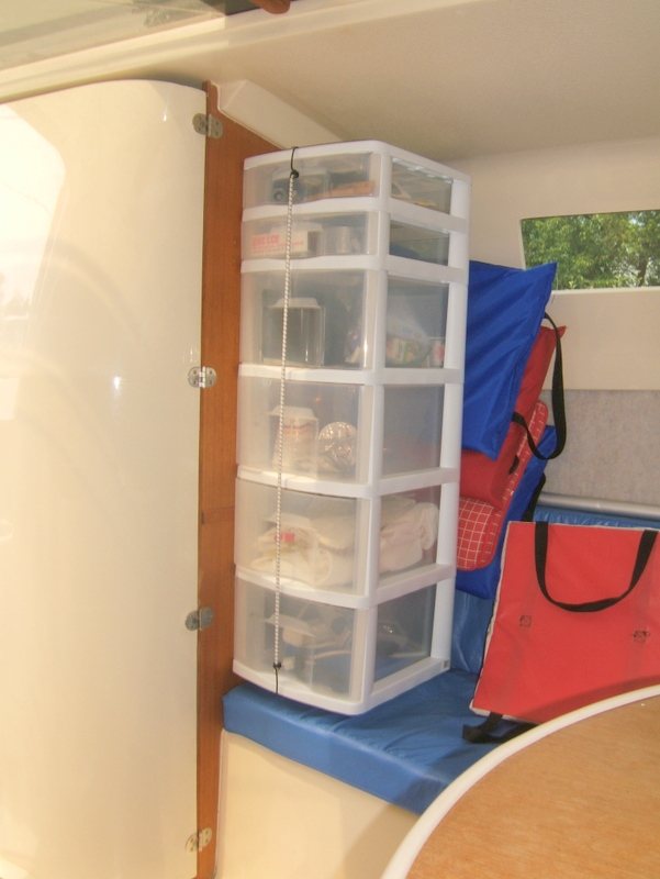 I was going to build and then found this was much easier and much, much less weight. And you can see what's in it. Oh, and a bungee cord with hooks on each end to keep the drawers from opening while heeling.