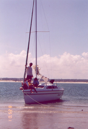 we entered our daggerboard Macgregor 26 in our harbor's distance race on the Alton Pool of the upper Mississippi. The winds were light, and we were sneaking upriver in the counter-current along the bank. To make our mark, we cut across the sunken island. (Sunken when the Corps of Engineers built the dam that makes the Alton Pool.) We had the board up and the rudder dragging. What we didn't realize was that our nearest competitor, a Cape Dory Typhoon, had been following us for over an hour, and kept following us. We drew about a foot and a half with everything up, he had a full length fixed keel at just over three feet. We made the mark and headed back downstream for the trophy, they spent about 45 minutes trying to get out of the river mud before throwing in the towel and starting the motor. And they really think we got them stuck on purpose!Hate to put a Mac photo on the Hunter board, but this was when they still made sailboats, not hybrids!