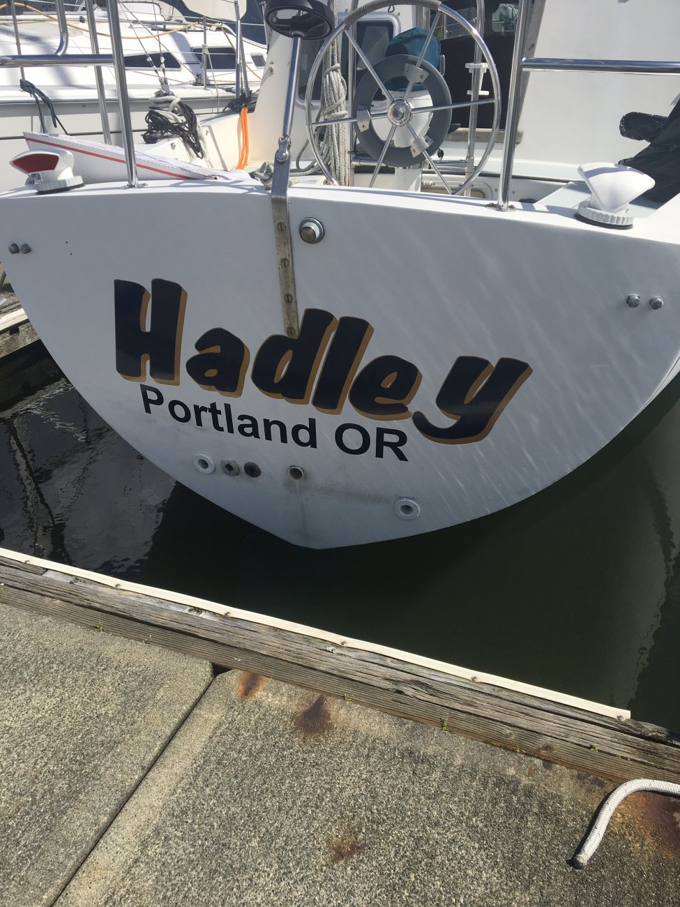 I feel a boat name should reflect emotion. The name Hadley reflects several personal and family emotions. First, my granddaughters name is Hadley. My Mom's maiden name was Hadley. I never knew my Granddad, Cmdr Hugh W Hadley. He was of the Pacific NW and of the sea. So as I sail his waters, I honor him in the choice of name.
