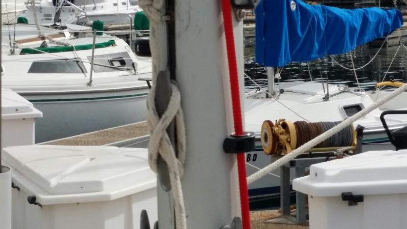 I was sort of scared to drill the boom and mast to add the cheek block and eyelet I needed for the final and proper installation. After talking with some people I dove in and it was easy. I removed the cleat on the boom use one of the old hole and drilled a new one and boom the cheek block was installed on the boom. Then the installation of the fairlead eyelet with a center punch and a sharp drill but and some stainless steel screws and I was done. I re-routed the line and took her out for a sail and it was so easy to put a reef in and shake it out all from the cockpit.