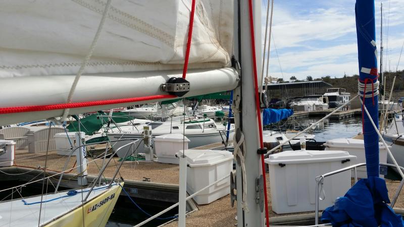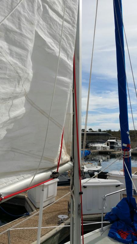 I started this last weekend and hillbilly'd the line through two horn cleats, one on the boom and one on the mast. First picture.