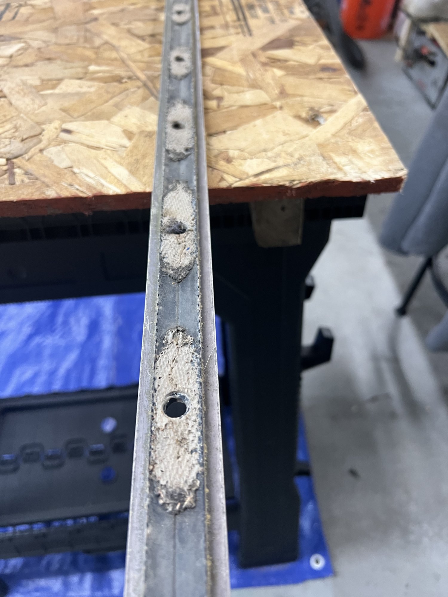 This winter, I did do a lot of preplanning and experimenting with materials during the months that it was to cold to cure epoxy outside. I started last week and with the help of another soul to turn screws from the top, have removed the all the hardware on the port side as it's in worst shape, only took 2 hours to remove. Most likely, it will take 2 days to re install. Here's where I am so far. The first cut will be the bow as that's in the most need since I crashed the bow pulpit into a stubborn pile in 2009. I've since adopted the boating adage "Never approach an object any faster than you want to hit it". The guy (aka, me) who made the repair had absolutely no idea what he was doing and made a crappy repair using bondo no less!