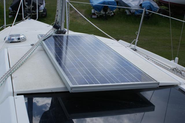 Hey Sum, that is a neat genset you built, I'm afraid I have too much stuff hanging off my stern and rails to add a genset like yours. I found a pic of the solar panel mount, I still have room to mount another panel if I need to without banging toes on the foredeck. You guys south of the 49th are lucky with all the low prices, everything up here is big bucks! Gary