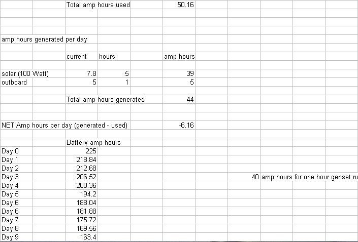 The solar estimate here should not be taken too seriously as this can vary a lot - but at least you can see what was used. MPPT vs PWM would change the solar output by about 10% but daily variations are likely a fair amount larger than that so I didnt bother with that detail. For the larger panel, use MPPT, I currently only need PWM for my smaller setup. Since solar can vary a lot, I think if you stay out very long, you pretty much need to bring along some method (such as a gas genset and charger) to compensate for a string of cloudy days. The more solar you add, the less chance of needing the gas genset - but you probably still need to bring it along if there is any chance of more than two or three cloudy days. Total daily amp hours used is based on my normal 15 amp hours plus 35 for the fridge = 50.. The fridge certainly complicates things, the charging is way simpler with just an ice chest.