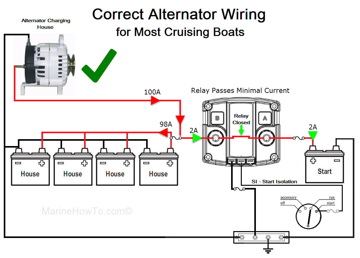 Let’s explore just the alternator for now. When I run my engine I want the charge power to be shared among my batteries. Generally the house battery is more depleted so I want to get it back to full before I stop for the night. When it is full I want to spill the excess over to the start battery. For years owners would use a manual switch to flip the charge from battery to battery. Being sailors they would sometimes forget. One or both batteries would be depleted. A clever solution was designed. An automatic relay placed between the House and Starter battery. Problem resolved.
